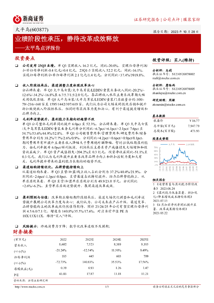 浙商证券:太平鸟(603877)-业绩阶段性承压,静待改革成效释放.pdf