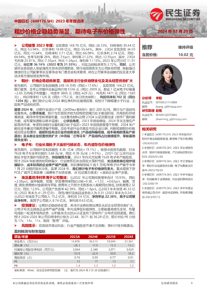 民生证券:中国巨石(600176)-2023年年报点评:粗纱价格企稳趋势渐显,期待电子布价格弹性.pdf