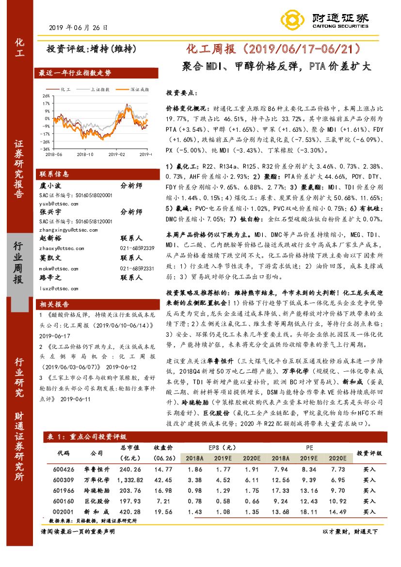 财通证券:化工周报:聚合MDI、甲醇价格反弹,PTA价差扩大.pdf