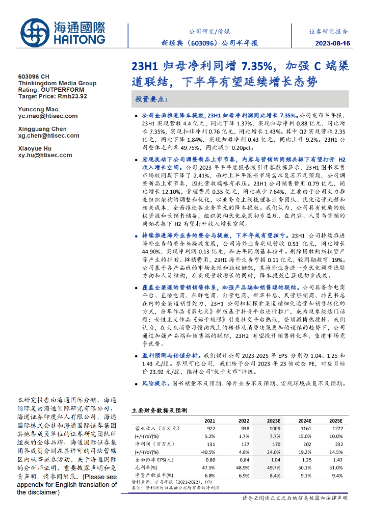 海通国际:新经典(603096)-公司半年报:23H1归母净利同增7.35%,加强C端渠道联结,下半年有望延续增长态势.pdf