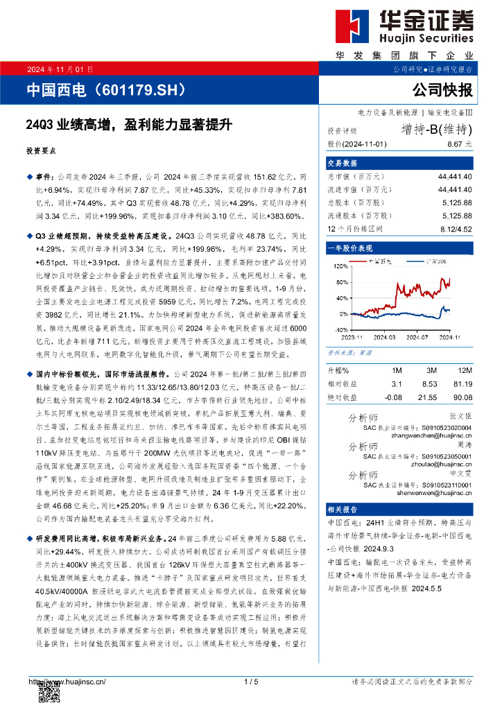 华金证券:中国西电(601179)-24Q3业绩高增,盈利能力显著提升.pdf