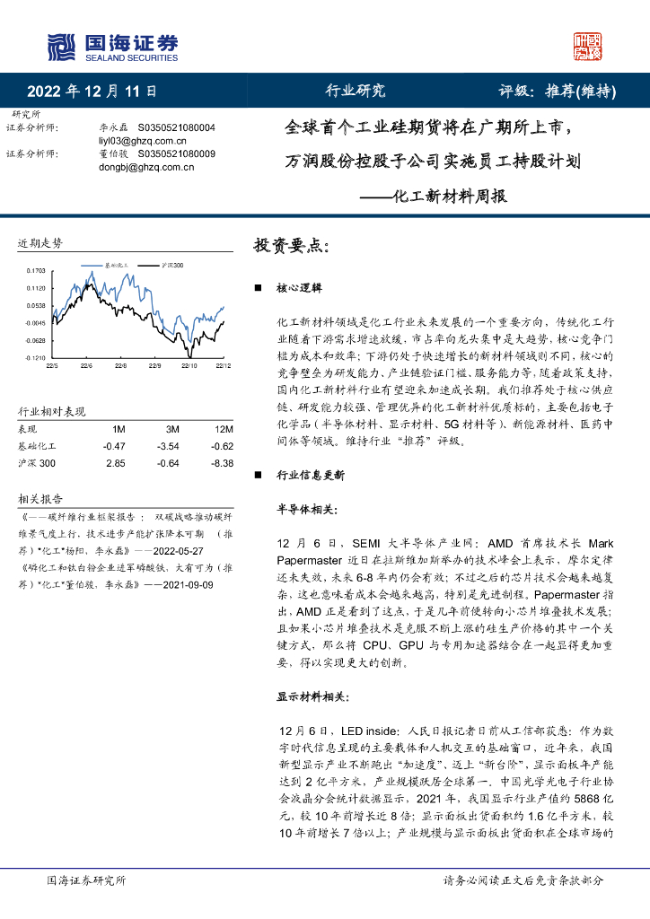 国海证券:化工新材料周报:全球首个工业硅期货将在广期所上市,万润股份控股子公司实施员工持股计划.pdf