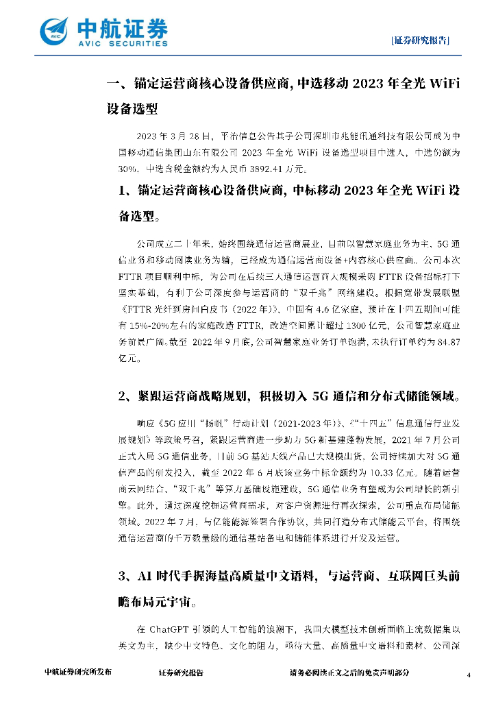中航证券:平治信息(300571)-锚定运营商核心设备供应商,中选移动2023年全光WiFi设备选型.pdf