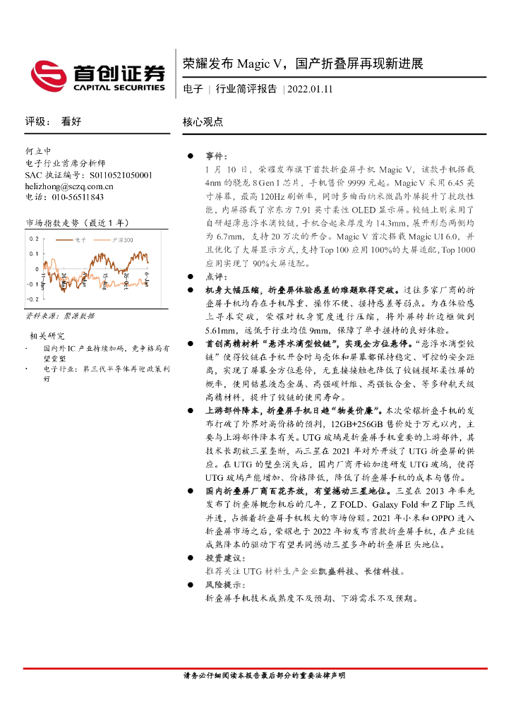 首创证券:电子行业简评报告:荣耀发布Magic V,国产折叠屏再现新进展.pdf