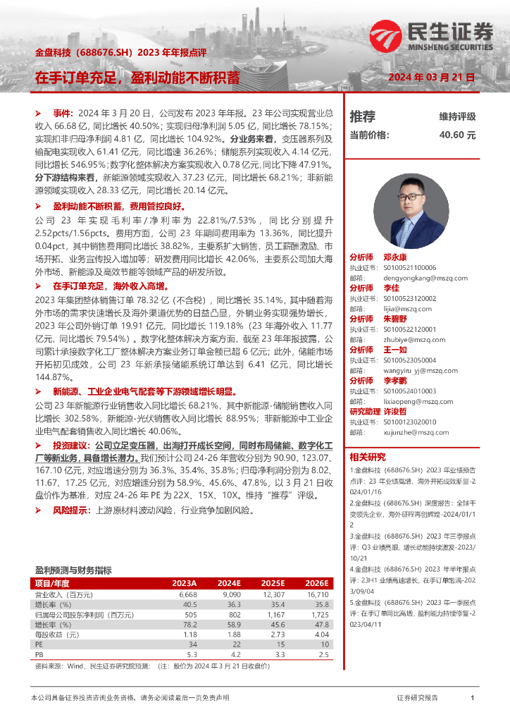 民生证券:金盘科技(688676)-2023年年报点评:在手订单充足,盈利动能不断积蓄.pdf