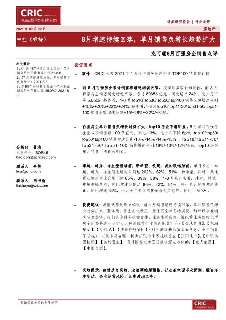 克而瑞证券:8月百强房企销售点评:8月增速持续回落,单月销售负增长趋势扩大.pdf