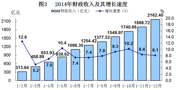 全年财政收入2162.4亿元,比上年增长8.1%。公共财政预算收入1422.05亿元,增长7.9%,其中,税收收入977.79亿元,增长11.7%。公共财政预算支出3475.92亿元,增长8.3%。