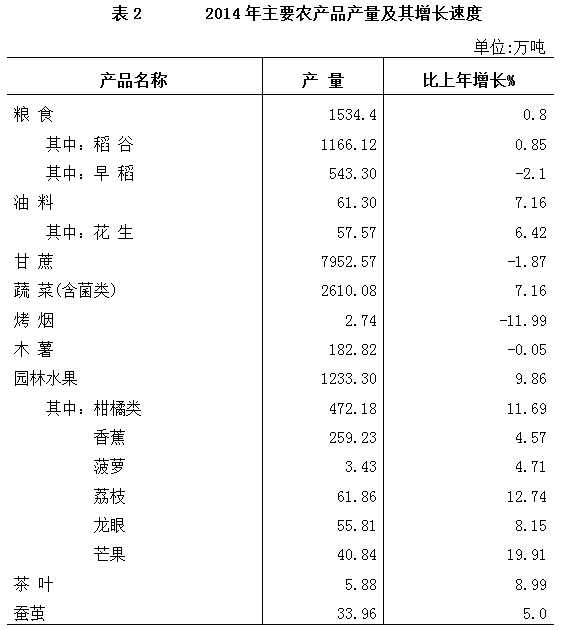 全年粮食产量1534.4万吨,比上年增加12.6万吨,增长0.8%。其中,夏粮产量36.9万吨,增长2.5%;早稻产量543.3万吨,下降2.1%;秋粮产量954.2万吨,增长2.5%。油料产量61.30万吨,增长7.2%;甘蔗产量7952.57万吨,下降1.9%;蔬菜产量(含食用菌)2610.08万吨,增长7.2%;园林水果产量1233.30万吨,增长9.9%。