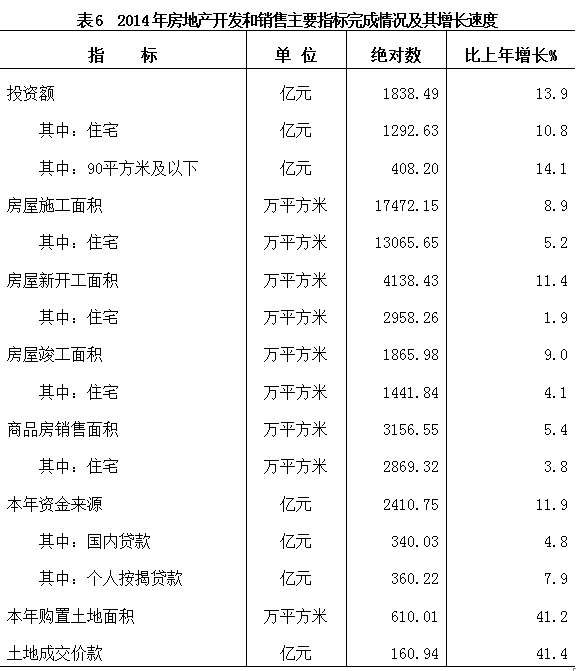 全年房地产开发投资1838.49亿元,比上年增长13.9%。其中,住宅投资1292.63亿元,增长10.8%;办公楼投资70.90亿元,增长37.2%;商业营业用房投资254.00亿元,增长45.2%。商品房施工面积17472.15万平方米,增长8.9%,其中住宅13065.65万平方米,增长5.2%。商品房竣工面积1865.98万平方米,增长9.0%,其中住宅1441.84万平方米,增长4.1%。商品房销售面积3156.55万平方米,增长5.4%,其中住宅2869.32万平方米,增长3.8%。