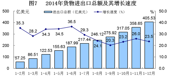 全年货物进出口总额405.53亿美元,比上年增长23.5%。其中,货物出口243.30亿美元,比上年增长30.2%;货物进口162.23亿美元,增长14.8%。进出口差额(出口减进口)81.07亿美元。从出口企业性质看,国有企业出口30.95亿美元,比上年增长29.7%;外商投资企业出口43.71亿美元,增长19.2%;私营企业出口167.37亿美元,增长33.6%。