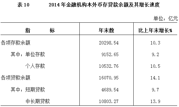 年末金融机构本外币各项存款余额20298.54亿元,比年初增加1898.06亿元,其中人民币各项存款余额20078.97亿元,增加1811.72亿元。年末金融机构本外币各项贷款余额16070.95亿元,比年初增加1954.93亿元,其中人民币各项贷款余额15585.46亿元,增加1897.15亿元。
