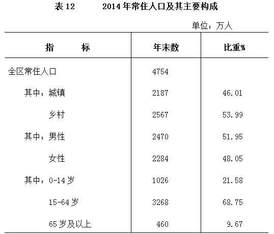 年末全区户籍总人口5475万人,比上年末增加53万人。年末常住人口[5]4754万人,比上年末增加35万人,其中城镇人口2187万人。全年出生人口72万人,出生率14.07‰;死亡人口30万人,死亡率6.21‰;自然增长率7.86‰。