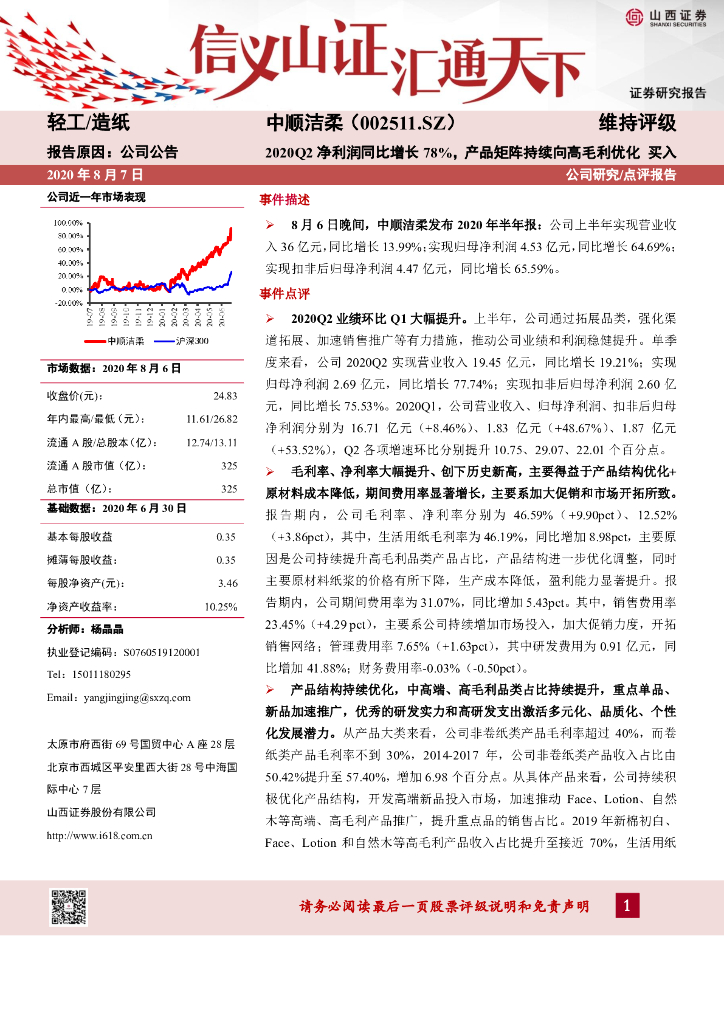 山西证券:中顺洁柔(002511)-2020Q2净利润同比增长78%,产品矩阵持续向高毛利优化.pdf