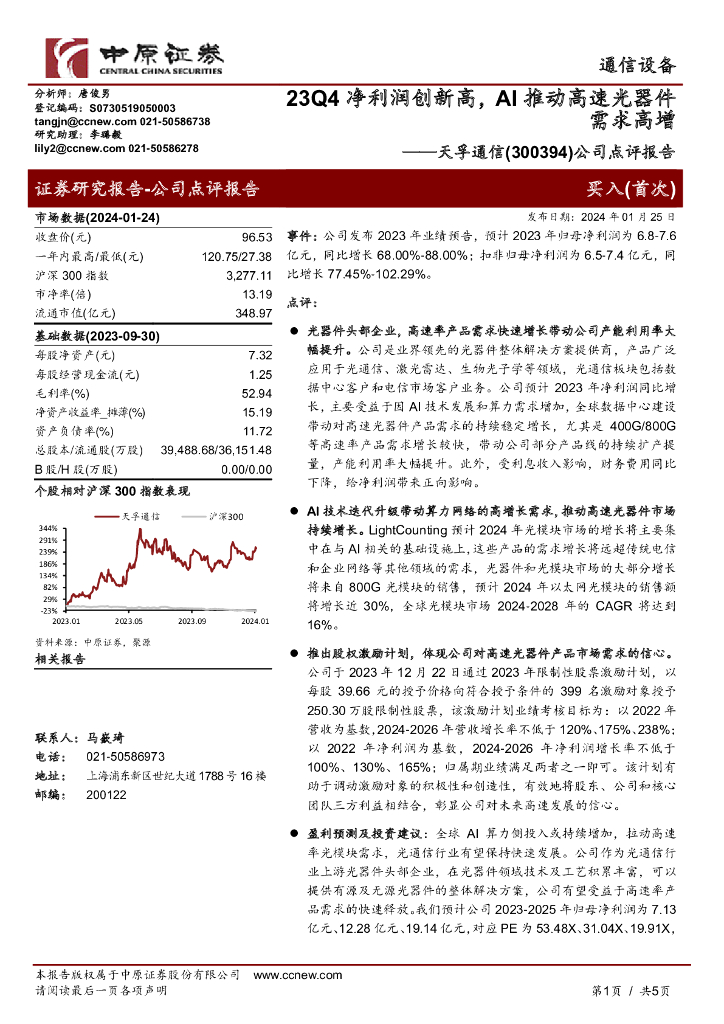 中原证券:天孚通信(300394)-公司点评报告:23Q4净利润创新高,AI推动高速光器件需求高增.pdf