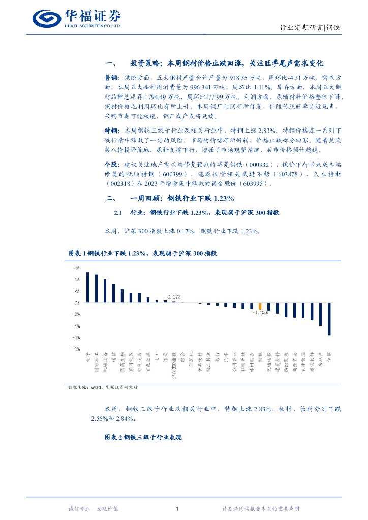 华福证券:钢铁行业周报:本周钢材价格止跌回涨,关注旺季尾声需求变化.pdf