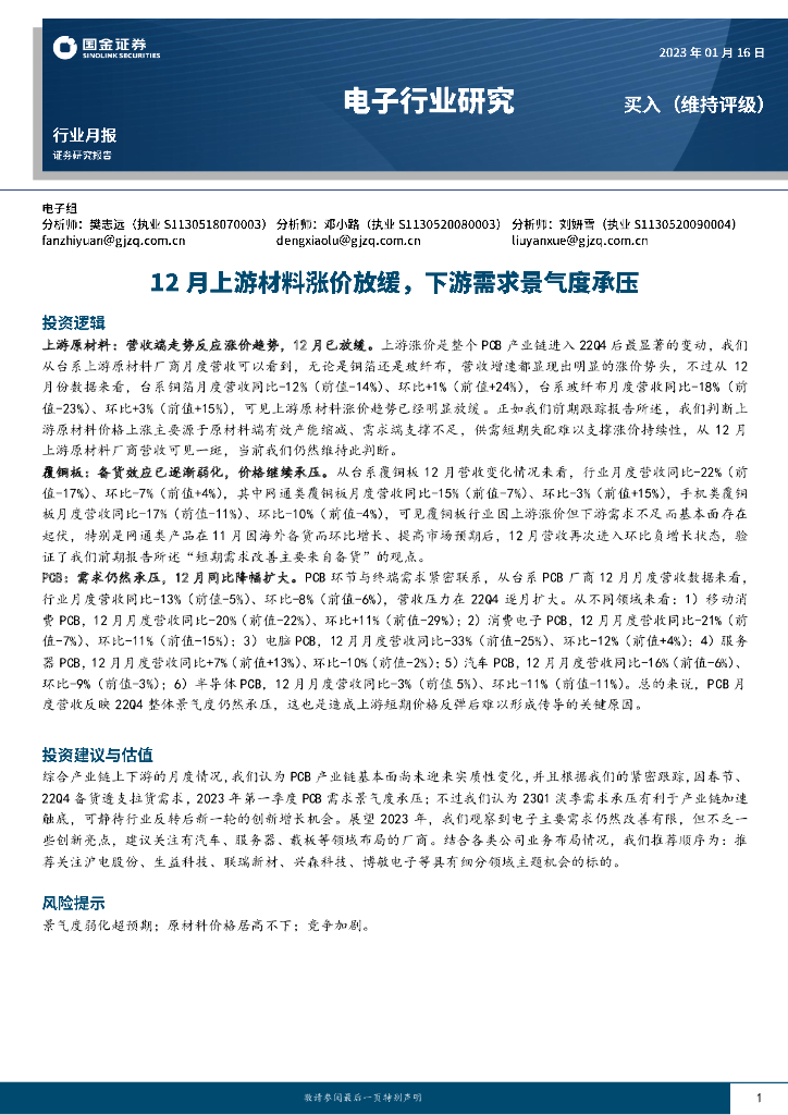 国金证券:电子行业月报:12月上游材料涨价放缓,下游需求景气度承压.pdf