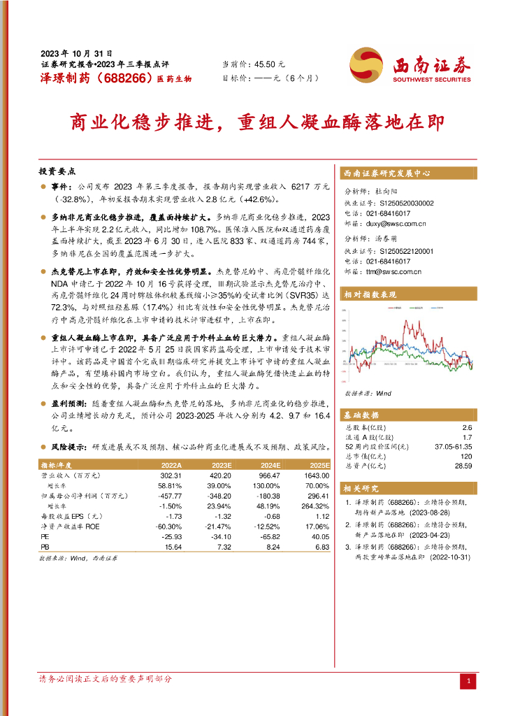 西南证券:泽璟制药(688266)-商业化稳步推进,重组人凝血酶落地在即.pdf
