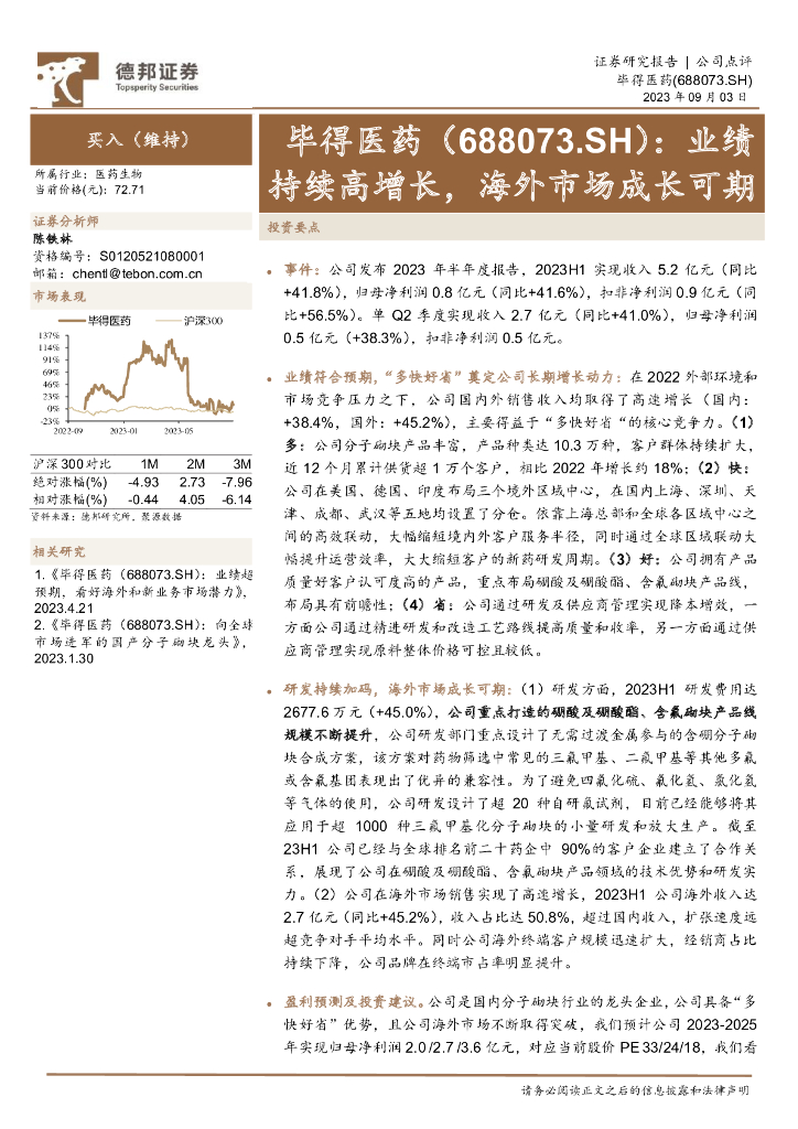德邦证券:毕得医药(688073)-业绩持续高增长,海外市场成长可期.pdf