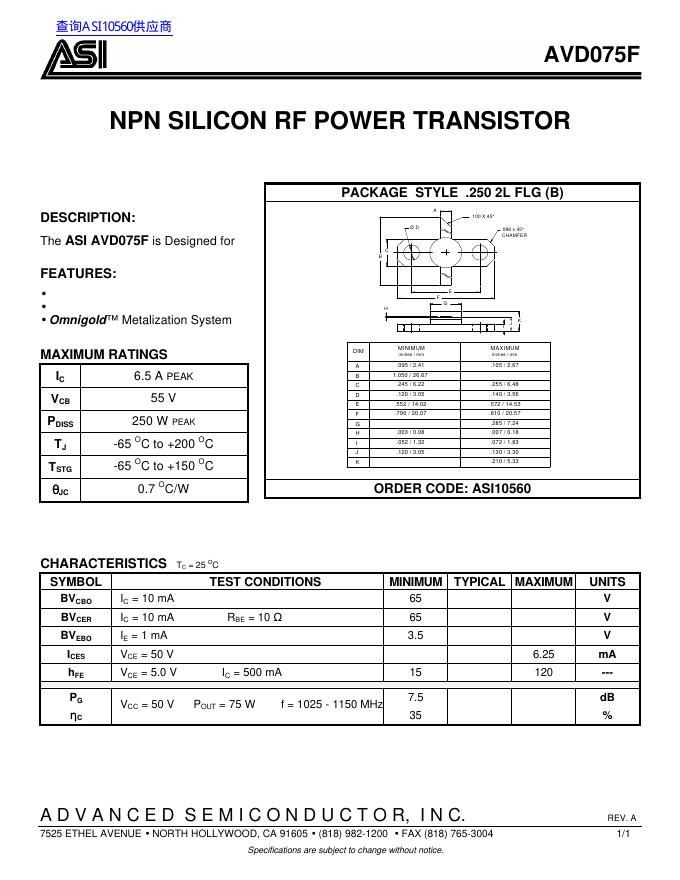 ASI AVD075F NPN SILICON RF POWER TRANSISTOR 数据手册.pdf