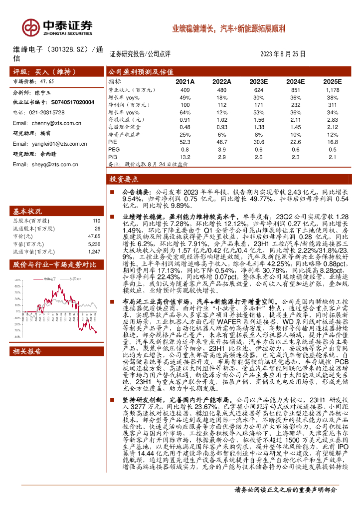 中泰证券:维峰电子(301328)-业绩稳健增长,汽车+新能源拓展顺利.pdf
