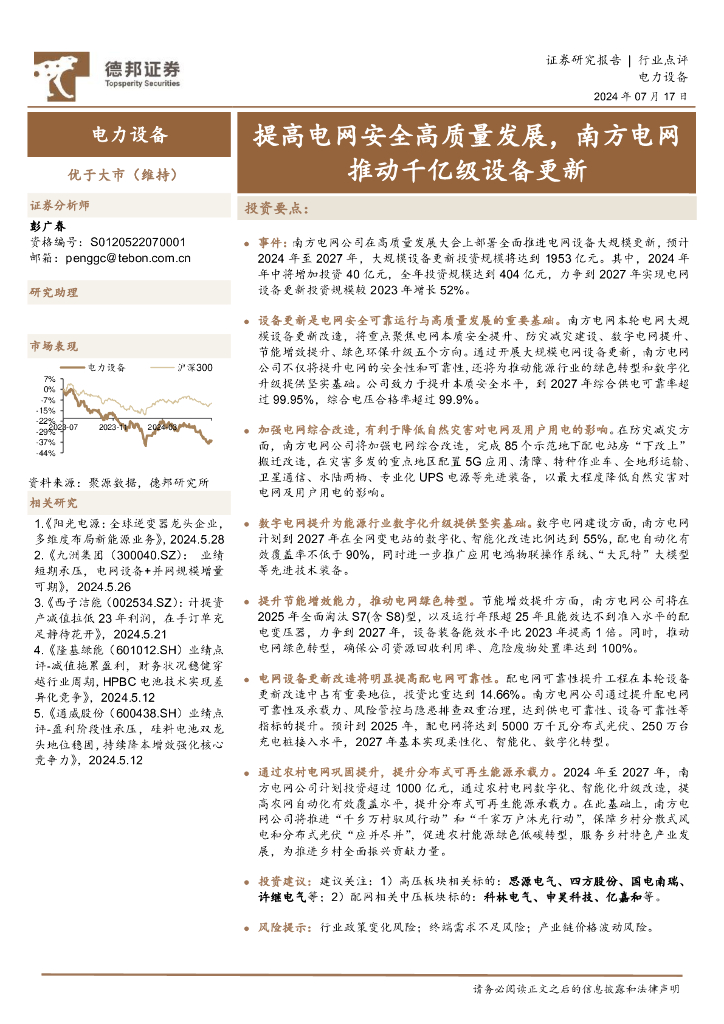 德邦证券:电力设备行业点评:提高电网安全高质量发展,南方电网推动千亿级设备更新.pdf