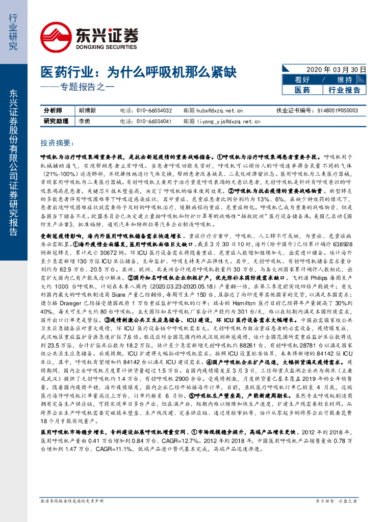 东兴证券:医药行业:专题报告之一:为什么呼吸机那么紧缺.pdf