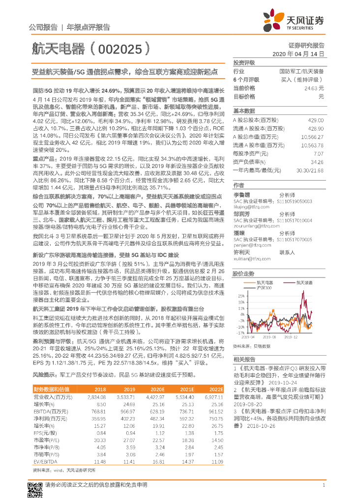 天风证券:航天电器(002025)-受益航天装备/5G 通信拐点需求,综合互联方案商或迎新起点.pdf
