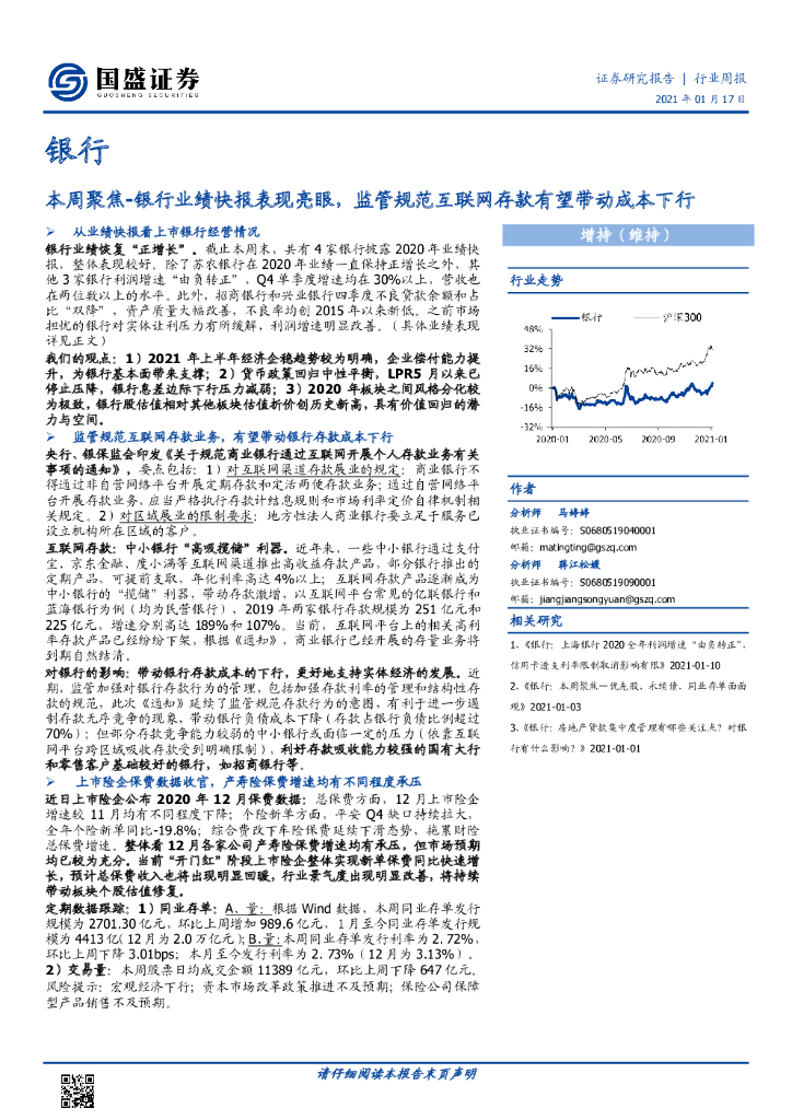 国盛证券:银行本周聚焦:银行业绩快报表现亮眼,监管规范互联网存款有望带动成本下行.pdf