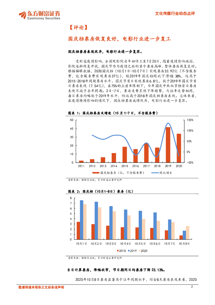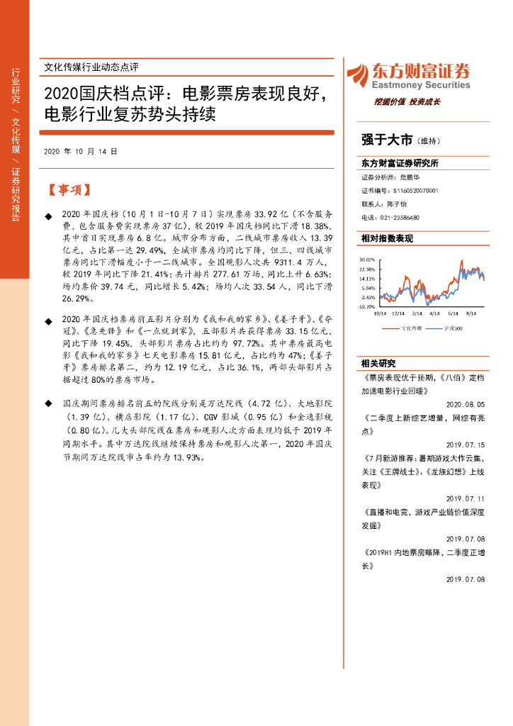 东方财富证券:文化传媒行业动态点评:2020国庆档点评:电影票房表现良好,电影行业复苏势头持续.pdf