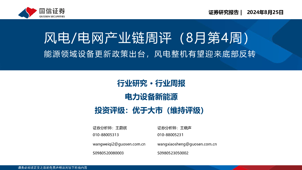 国信证券:风电/电网产业链周评(8月第4周):能源领域设备更新政策出台,风电整机有望迎来底部反转.pdf