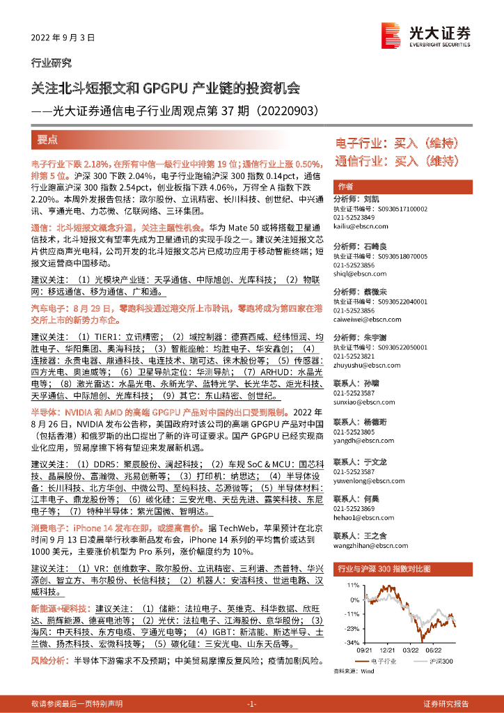 光大证券:通信电子行业周观点第37期:关注北斗短报文和GPGPU产业链的投资机会.pdf