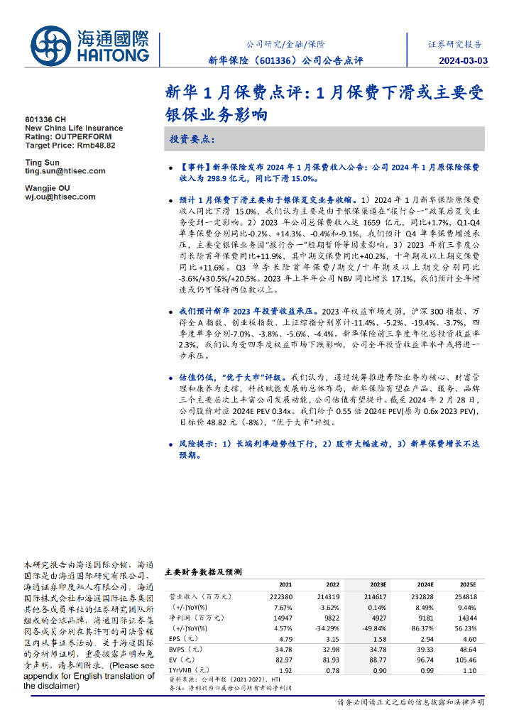 海通国际:新华保险(601336)-公司公告点评:新华1月保费点评:1月保费下滑或主要受银保业务影响.pdf
