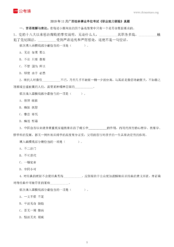 2019年11月广西桂林事业单位考试《职业能力测验》真题.pdf