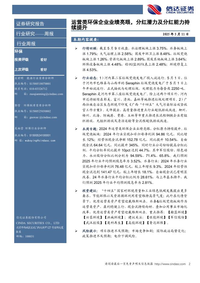 信达证券:环保行业周报:运营类环保企业业绩亮眼,分红潜力及分红能力持续提升.pdf