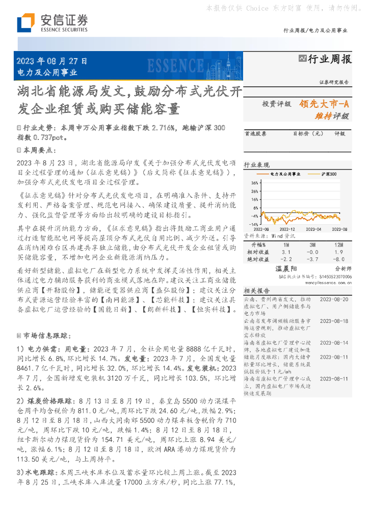 安信证券:电力及公用事业行业周报:湖北省能源局发文,鼓励分布式光伏开发企业租赁或购买储能容量.pdf