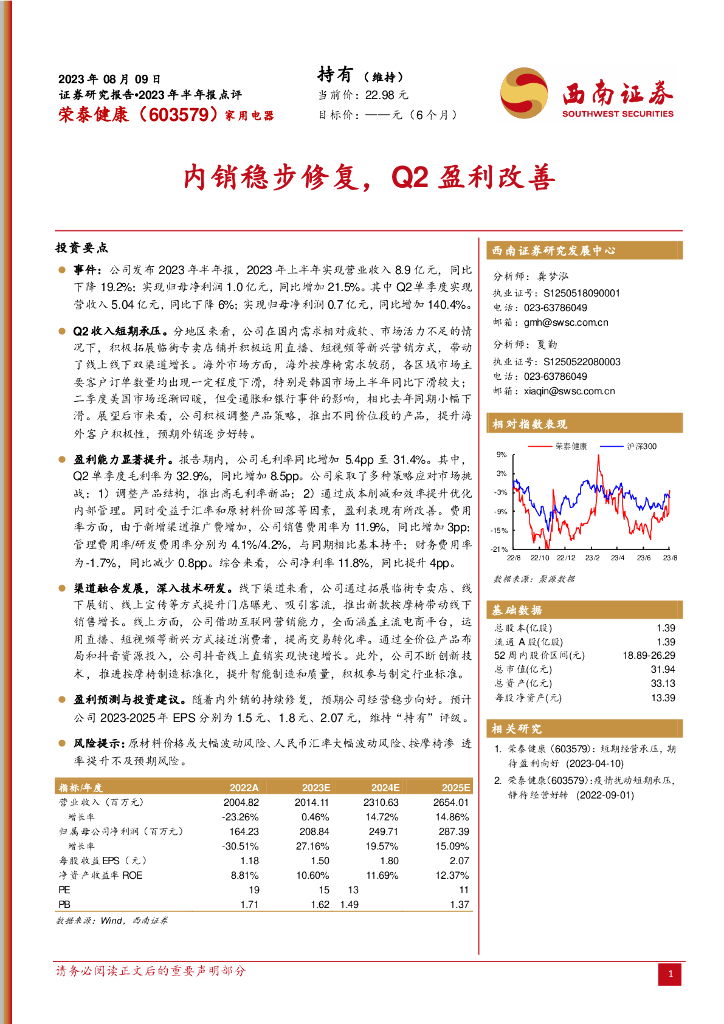 西南证券:荣泰健康(603579)-内销稳步修复,Q2盈利改善.pdf