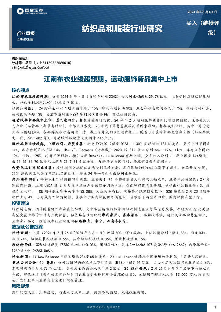 国金证券:纺织品和服装行业研究:江南布衣业绩超预期,运动服饰新品集中上市.pdf
