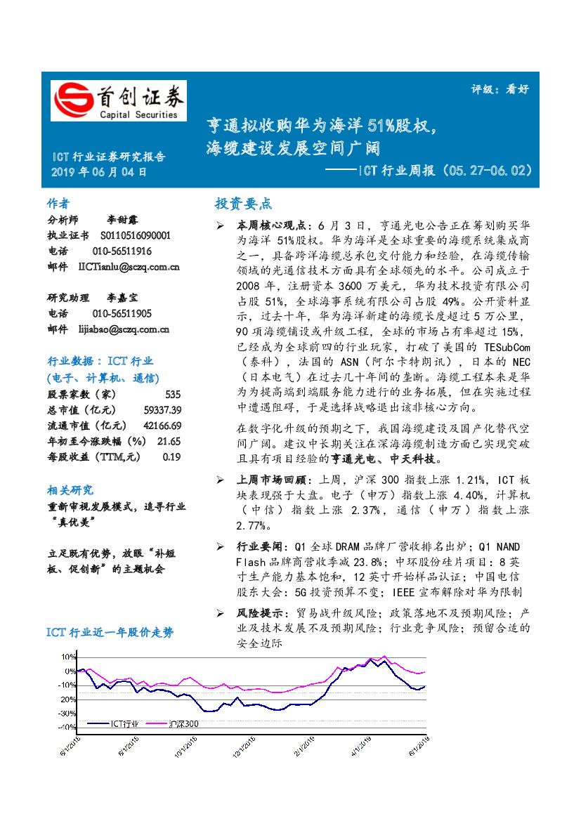 首创证券:ICT行业周报:亨通拟收购华为海洋51%股权,海缆建设发展空间广阔.pdf