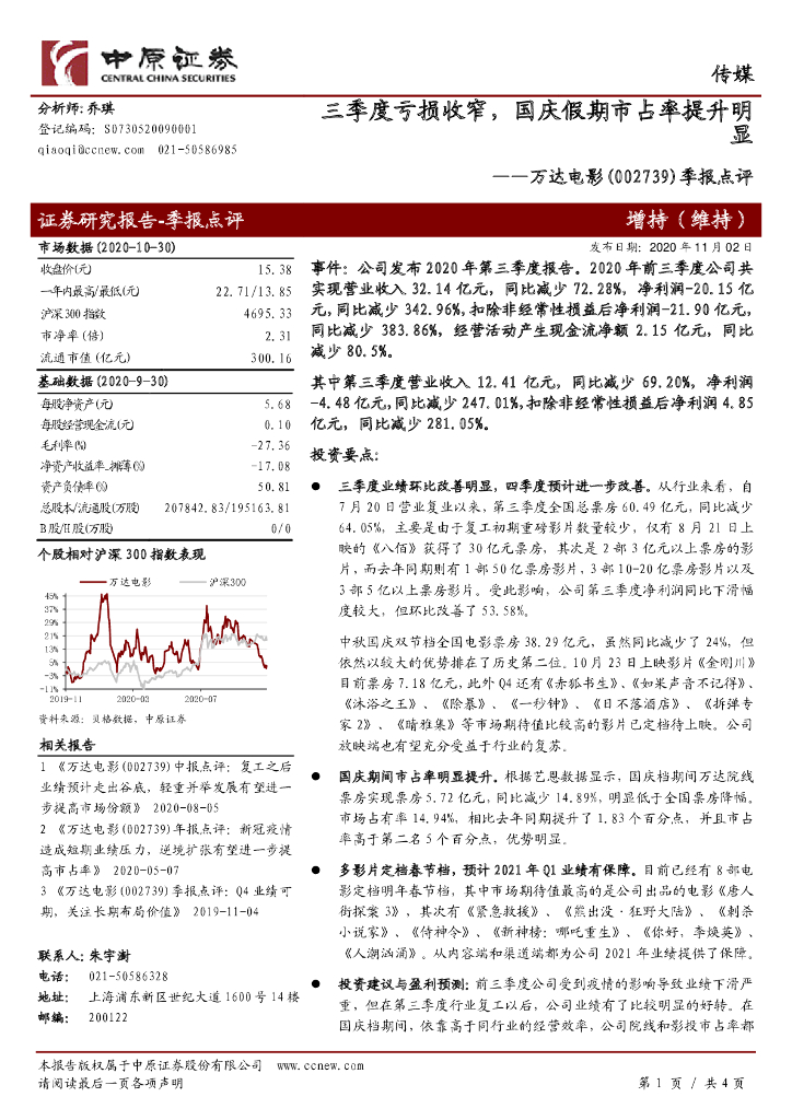 中原证券:万达电影(002739)-季报点评:三季度亏损收窄,国庆假期市占率提升明显.pdf
