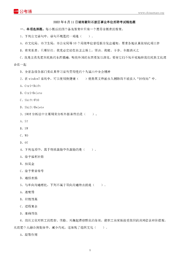 2022年6月11日湖南衡阳石鼓区事业单位招聘考试精选题.pdf
