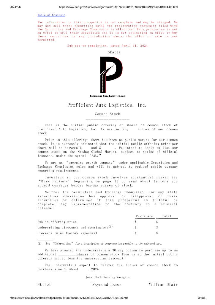 Proficient Auto Logistics(PAL)美股纳斯达克IPO上市招股说明书(Form S-1)(英文版).pdf