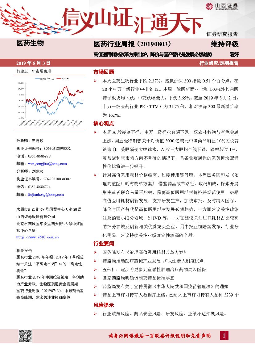 山西证券:医药行业周报:高值医用耗材改革方案出炉,降价与国产替代是发展必然趋势.pdf