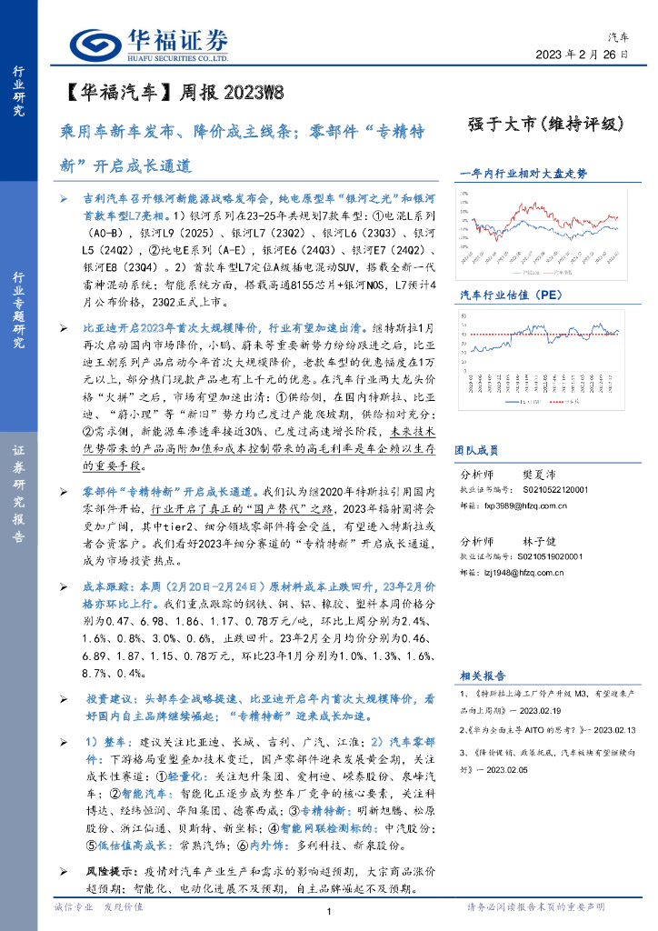 华福证券:【华福汽车】周报2023W8:乘用车新车发布、降价成主线条;零部件“专精特新”开启成长通道.pdf