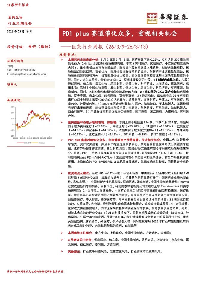 华源证券:医药行业周报:PD1plus赛道催化众多,重视相关机会.pdf