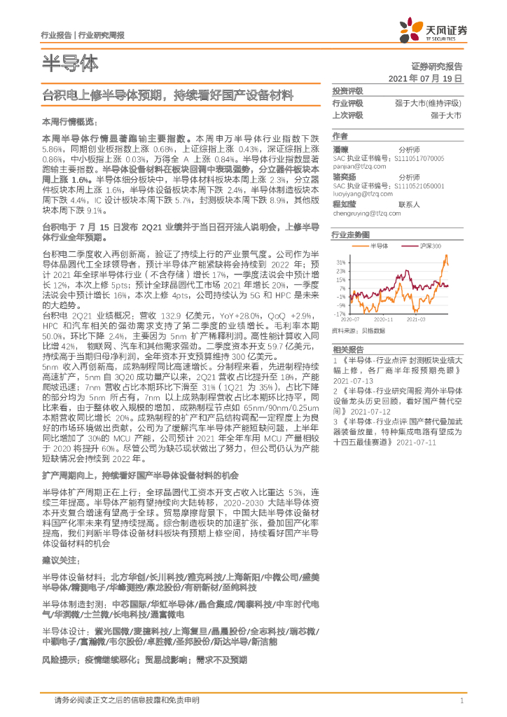 天风证券:半导体行业研究周报:台积电上修半导体预期,持续看好国产设备材料.pdf