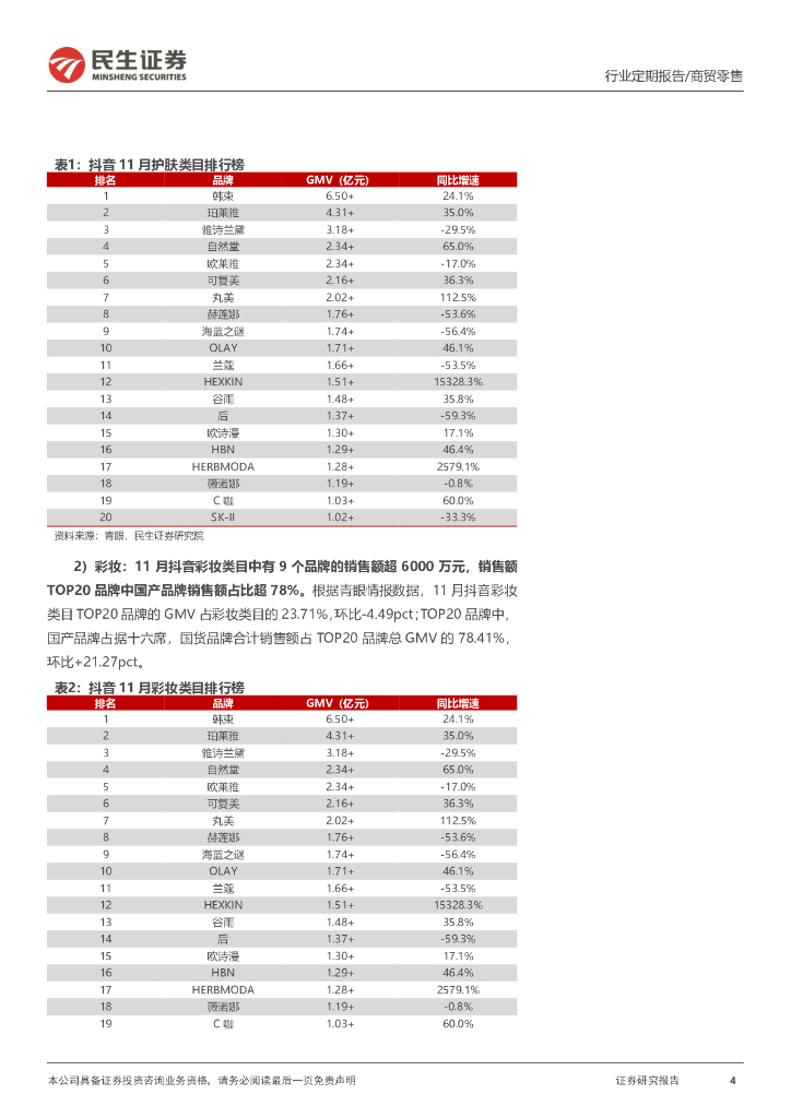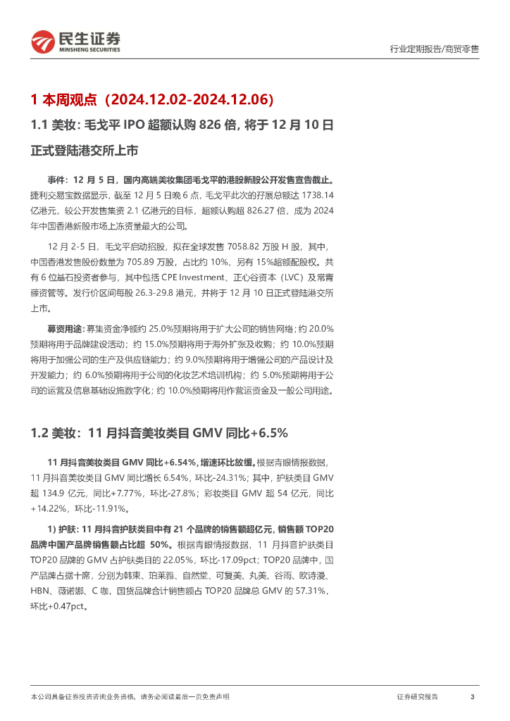 民生证券:零售周观点:毛戈平将于10日正式登陆港交所上市,11月抖音美妆GMV同比+6.5%.pdf