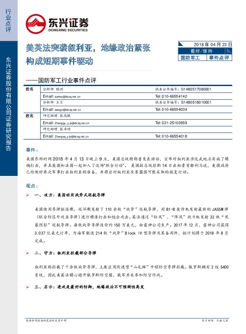 东兴证券:国防军工行业事件点评:美英法突袭叙利亚,地缘政治紧张构成短期事件驱动.pdf