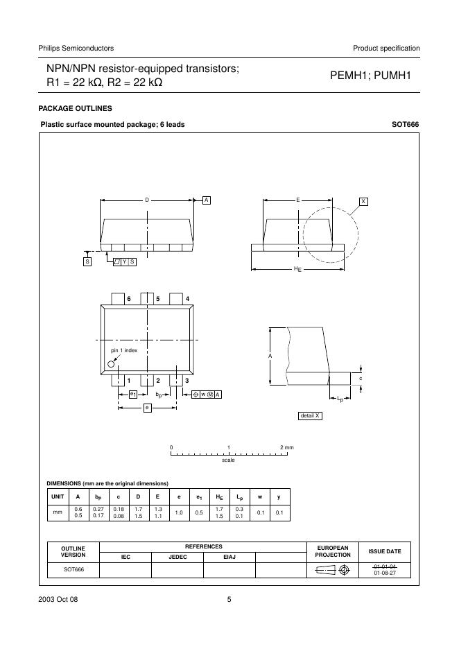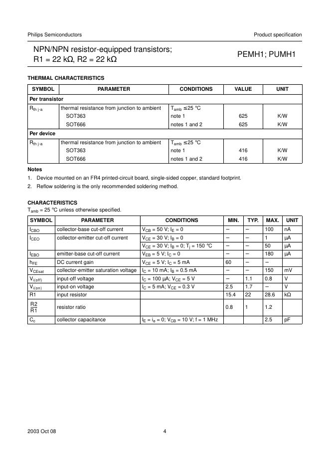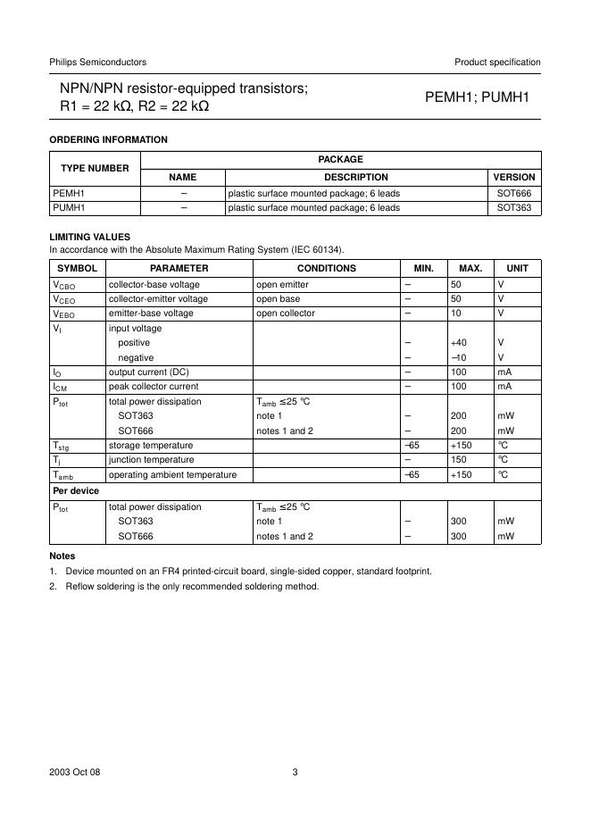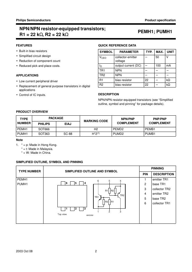 PHILIPS PEMH1; PUMH1 NPN/NPN resistor-equipped transistors; R1 = 22 kΩ, R2 = 22 kΩ 数据手册.pdf