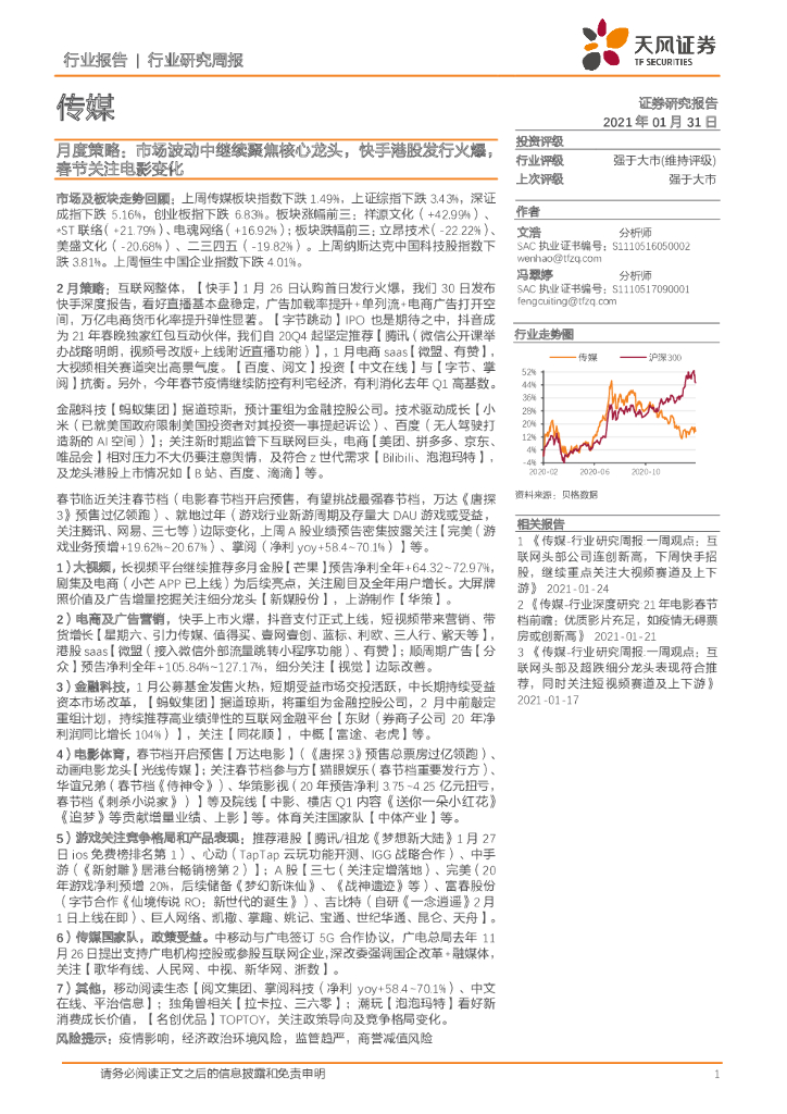 天风证券:传媒行业月度策略:市场波动中继续聚焦核心龙头,快手港股发行火爆,春节关注电影变化.pdf