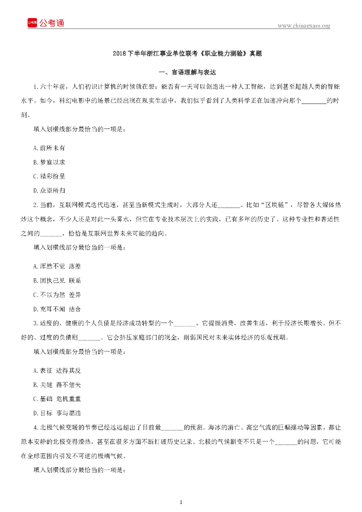 2018下半年浙江事业单位联考《职业能力测验》真题.pdf